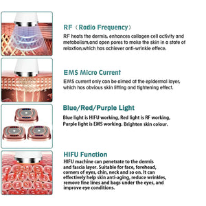 Our HIFU RF EMS facial machine has the unique ability to double the absorption of nutrients to tone and rejuvenate your skin. It's an essential addition to your daily facial care regime. For optimal results, use it for not more than half an hour each time, moving from the bottom to the top of your face. Use with skincare products such as essential oils or lotions for maximum effect.