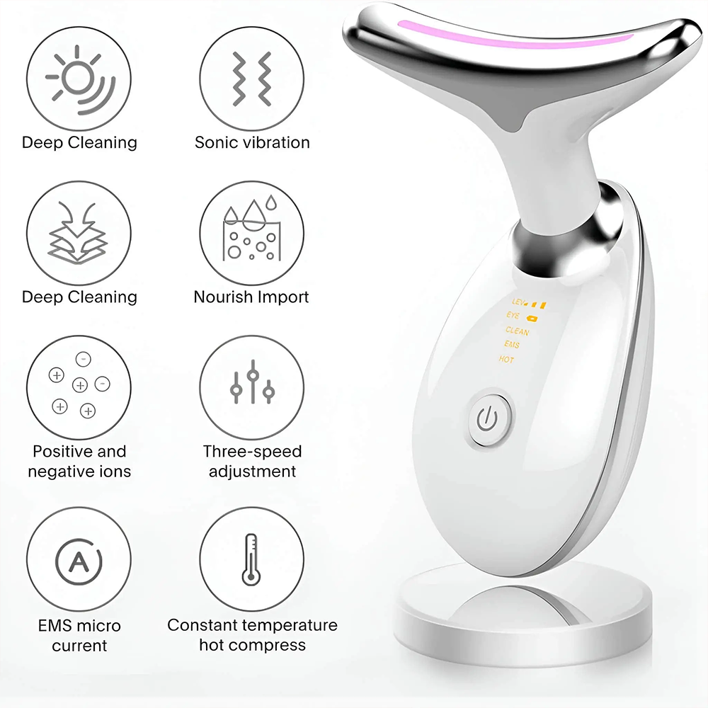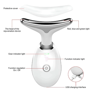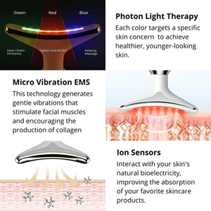 This high-tech beauty device combines gentle vibrations with 3‑color Photon LED Light Therapy (blue, green, and red wavelengths) to firm and tone the skin of your face and neck. It effectively lifts and tightens, smooths fine lines and wrinkles, improves elasticity, reduces puffiness, and enhances blood oxygenation for a revitalized look.
