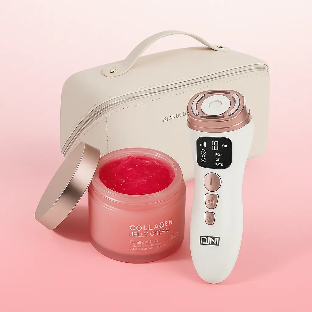 Seamless Daily Ritual — Use the Mini HIFU RF Device first for targeted skin toning, follow with the Collagen Jelly Cream to enhance absorption and hydration, and neatly pack everything—and beyond—in the spacious cosmetic bag for on-the-go beauty.